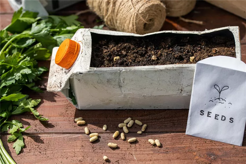 Damit in der Milchtüte ab sofort kleine Pflanzen Platz finden, müssen die Milchtüten ein bisschen umgebaut werden. Je nachdem, wie groß die neuen Pflanzentüten werden sollen, wird der obere Teil mit einem Cuttermesser vom Rest der Milchtüte abgetrennt. Dann sollten die Milchtüten gründlich ausgespült und mit Spüli gewaschen werden, damit später nichts stinkt oder schimmelt. Anschließend werden die Milchtüten so lange zusammengedrückt, bis sie sich leicht formen lassen. Wer die Milchtüten bemalen möchte, kann dann an der Naht vorsichtig die erste Schicht Papier von den Milchtüten lösen. Dann werden die Ränder umgeklappt, damit es gekrempelt aussieht.