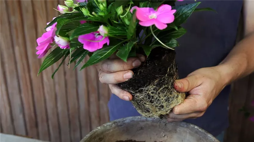 Durch das Auflockern des Wurzelballens und das Entfernen von alter Erde, erleichtern Sie der Pflanze zusätzlich das schnelle Einwurzeln.
